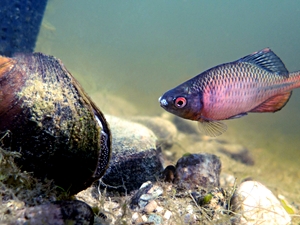 ![]() Bitterling zur Paarungszeit an "seiner" Muschel. Bild: Michael Wurm (Quelle). |