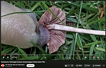 ![]() YouTube-Video: Schwarzer Schnegel (Limax cinereoniger) frisst einen Pilz. Video von Martina Eleveld. |