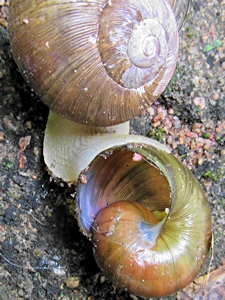 ![]() Natalina cafra hat einen kleineren Artgenoss en gefressen und trägt nun seine Schale am Schwanzende mit sich herum, um den darin enthaltenen Kalk zu absorbieren. Scottburgh, KwaZulu-Natal, Südafrika, Bild: Peter Vos (iNaturalist). |