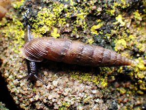 ![]() Graugelbe Rucksackschnecke (Testacella haliotidea): Auck- land, Neuseeland. Bild: Joseph Knight (iNaturalist). |