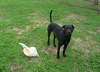 ![]() Syrinx aruana: Gehäuse in Vergleich mit dem Hund des Fotografen. Bild: Heather Hawk (iNaturalist)., Queensland, AUS. |
