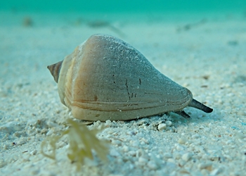eine Fechterschnecke (Strombus), die versucht, sich mit ihrem