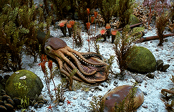 ![]() Eine Szene aus dem Ordovizium: Cameraceras verspeist einen Trilobiten. Quelle: R. Thomas, C. Wozniak: Earth History Resources. |