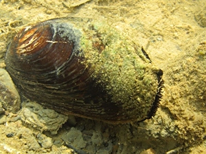 Schwachzähnige Flussmuschel (Microcondylaea bonelli) aus dem Fluss Mirna (Istrien).