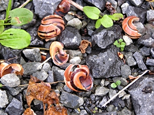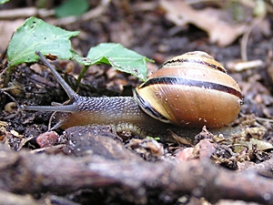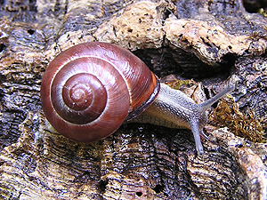 ![]() Burgunderrot gefärbtes Exemplar der Hainbänderschnecke (Cepaea nemoralis). Bild: Robert Nordsieck. |