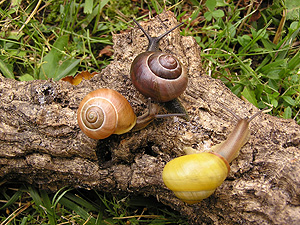 ![]() Gartenbänderschnecke (links) und gerippte Bänderschnecke (Caucasotachea vindobonensis). Bild: Robert Nordsieck. |