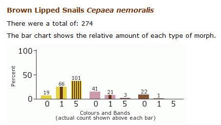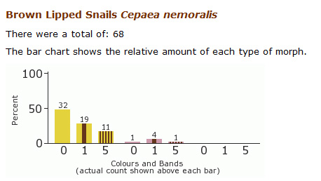 Nebenstehendes Ergebnis einer Auszählung von Hainbänderschnecken im Rahmen des Evolution Megalabs (s. u.) in Bad Kreuznach (Nordsieck, R., 2009, Schaubild D1) beweist aber, dass dies keineswegs der Fall ist. Von knapp 70 gezählten Schnecken an einer mit Efeu bewachsenen Mauer war die große Mehrzahl gelb und ungebändert, gefolgt von gelben, einfach gebänderten Schnecken und gelben, fünffach gebänderten Schnecken. Braun gefärbte Schnecken wurden gar nicht gefunden.