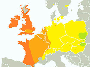 |  Verbreitungskarte von Cornu aspersum (orange), Helix pomatia (gelb) und Helix lutescens (grün) in Europa. Quelle: Kerney et al. (1983) (im Rahmen des Bearbeitungsgebiets). Siehe auch:  Verbreitungskarte von Francisco Welter-Schultes. |