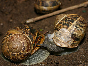 |  Die Paarung läuft bei Cornu aspersum anders, als bei der hei- mischen Helix pomatia, wie hier der Fotograf Hans Josef Köh- ler beobachtet hat. |