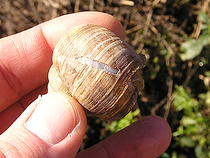 |  Weinbergschnecke (Helix pomatia) mit den Spuren eines Lauf- käferangriffes, die bereits wieder repariert werden. Bild: Robert Nordsieck. |