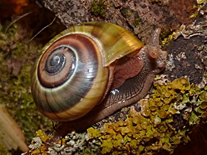 |  Bei der Grünen Koboldschnecke (Hemiplecta wichmanni) tritt der Mantel deutlich unter der Schalenmündung hervor. Bild: Martina Eleveld. | |