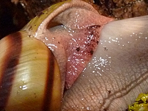 |  Grüne Koboldschnecke (Hemiplecta wichmanni), Blick auf den Mantel und einen Teil des Fußsaums. Bild: Martina Eleveld. |