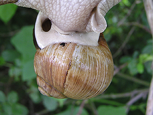 ![]() Die Schalenmündung einer lebenden Weinbergschnecke. Aus diesem Blickwinkel sind der Mantel und das Atemloch beson- ders gut zu erkennen. Bild: Robert Nordsieck. |