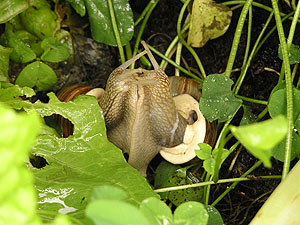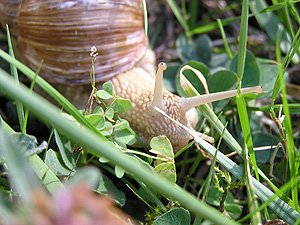 ![]() Der beschwerliche Weg einer Weinbergschnecke durch das Unterholz offenbart hier den Anblick der Fußsohle. Bild: Robert Nordsieck. |