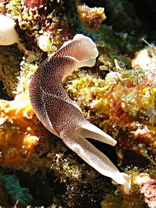 ![]() Blick auf das Schwanzende von Chelidonura a- moena ("Starry swallow tail slug"). Bild: Silke Baron (Quelle). |