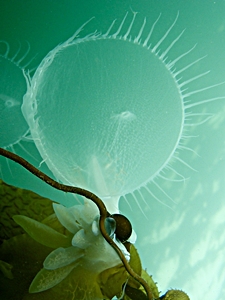 Einen ganz erstaunlichen Anblick bietet die Löwenkopfschnecke (Melibe leonina) bei der Nahrungssuche. Die etwa 5 cm kleine Nacktschnecke kommt an der Westküste Nordamerikas, von Alaska bis Baja California im Süden vor. Das fast durchsichtige Tier mit den blattförmigen Rückenanhängen, die als Kiemen dienen und von Blutgefäßen durchzogen sind, lebt im Kelpwald, wo es auf den Pflanzen umher kriecht und mit einer unverwechselbaren drehenden und windenden Bewegung auch schwimmen kann. Während der Paarungszeit im Spätsommer kann man die kleinen Schnecken oft zu Tausenden im Kelpwald an den Pflanzen sitzen sehen.