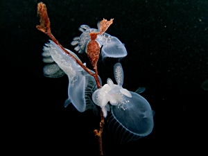 ![]() Kaum als Schnecke zu erkennen: Löwenkopf- schnecke (Melibe leonina) beim Planktonfang. Bild: Jackie Hildering (Quelle). |