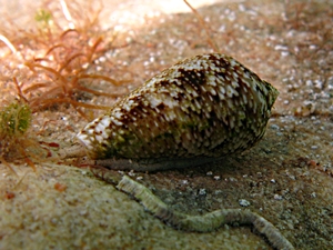 Nur wenig bekannt ist, dass es auch im Mittelmeer Kegelschnecken gibt. Verglichen mit den tropischen Arten ist die Mittelmeer-Kegelschnecke (Conus ventricosus) mit etwa 2 cm eine sehr kleine Schnecke. Wie seine größeren Verwandten hat aber auch er einen Giftzahn, mit dem er, in Wasserpflanzen des Flachwassers und der Gezeitenzone versteckt, nach marinen Würmern jagt.