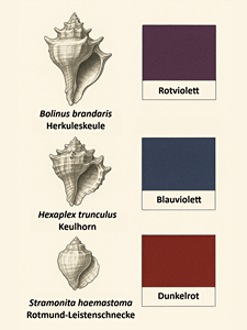 ![]() Purpurschnecken und ihre Farbstoffe. Schemazeichnung nach Wikipedia. |