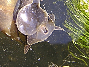 Eine Spitzschlammschnecke (Lymnaea stagnalis) weidet den Algenrasen auf der Wasseroberfläche ab. Beachte die sicht- bare Radula! Bild: Robert Nordsieck. |