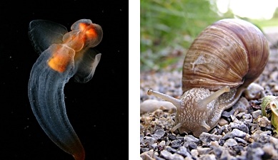 ![]() In jeder Hinsicht sehr unterschiedlich, aber dennoch beides Schnecken. Links: See-Engel (Clione limacina), rechts: Weinbergschnecke (Helix pomatia). Bilder: Kevin Raskoff (Quelle), links, und Cornelia Kothmayer (rechts). |