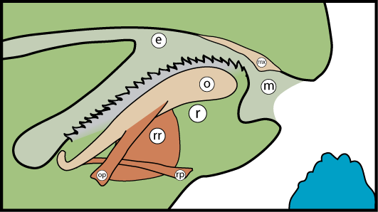 Beschriftung: e = Ösophagus; m = Mundöffnung; mx = Kiefer; o = Radulaknorpel (Odontophor); op =
