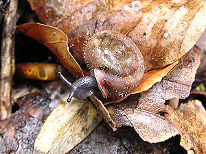 ![]() Eine Wegschnecke (Arion rufus ?) im Wald. Bild: Robert Nordsieck. |