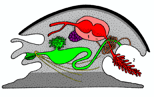 Beschreibung: Dunkelgrau: Fuß und Mantel. Hellgrau: Kopf und innerer Körper. Schwarz: Schale. Organsysteme: Rot: Kreislauf. Grün: Verdauung. Gelb: Nervensystem. Orange: Exkretion. Violett: Gonade (Geschlechtsorgan). Speziell: Hellrot: Herzbeutel (Perikard). Dunkelgrün: Radula. 1: Herz, 2: Kieme (Ctenidium).