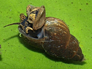|  Schnauzenschnecke (Bithynia tentaculata) mit charakteristi- scher Mündungsform und konzentrischem Operculum. Bild: © Alexander Mrkvicka, Wien. |