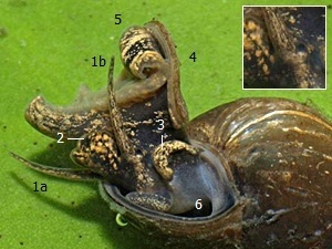 |    Schnauzenschnecke (Bithynia tentaculata) beim Aufklappen des Deckels. Bilder: Eric Walravens, (Quelle). Bild rechts: 1a, b: Fühler; 2: Schnauze; 3: Penis?; 4: Operculum; 5: Fuß; 6: Mantelhöhle. Eingeblendetes Bild: Auge. |
