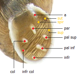 | Mündungsarmatur einer Kornschnecke (Chondrina generosensis). Schwarz: Vorhandene Mündungsfalten: a: Angularis; par: Parietalis; pal sup: Palatalis superior; pal inf: Palatalis inferior; infr: Infrapalatalis; col: Columellaris; infr col: Infra-columellaris. Gelb: Fehlende Mündungsfalten: sut: Suturalis; spir: Spiralis; sup: Suprapalatalis. Quelle: Ehrmann, P.: "Weichtiere", in: Die Tierwelt Mitteleuropas, Leipzig, 1956. |