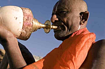 ![]() Hinduistischer Priester bläst während eines Festes auf einem Shankha. Quelle: Wikipedia. Bild: Claude Renault. |