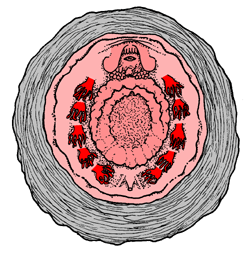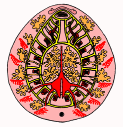 Gelb: Nervensystem; Orange: Exkretionsorgane; Rot: Herz und Kiemen; Dunkelrot: Muskulatur. |