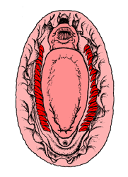 Hellgrau: Gürtel; Dunkelgrau: Schalenplatten; Hellrosa: Mantel; Dunkelrosa: Fuß; Rot: Kiemen. Quelle: Livingstone, Biodidac, weitere Bearbeitung: R. Nordsieck. |