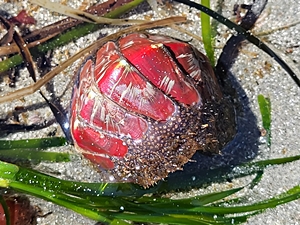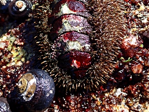![]() Käferschnecke (Tonicella lineata) auf dem Skelett eines See- Igels. Bild: Jerry Kirkhart (Quelle). |